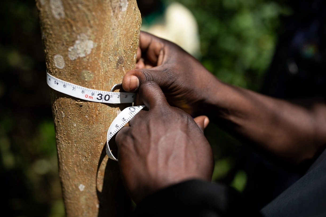 Fák átmérőjének mérése a Budongo-Bugoma zöldfolyosónál, Ugandában. A terepi felméréseket regionális központok, általában botanikus kertek szakértői végzik, akik rendelkeznek a szükséges taxonómiai ismeretekkel az őshonos és egzotikus fajok pontos beazonosításához. Kép: Luke Dray.