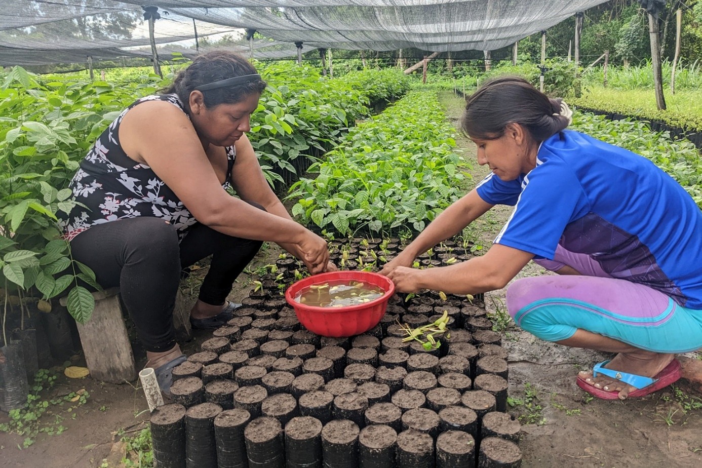 Linda és Guadeloupe a bolíviai SICIREC faiskolában dolgoznak. A SICIREC által vezetett, az Ecosia által finanszírozott projekt egy nagyobb, kisgazdálkodókkal együttműködő szén-dioxid-gazdálkodási projekt része. A projekt két helyszínét 2024-ben mérték fel, mindkettő megszerezte a TGBS szabvány szerinti tanúsítást. Kép: Antonia Burchard-Levine.