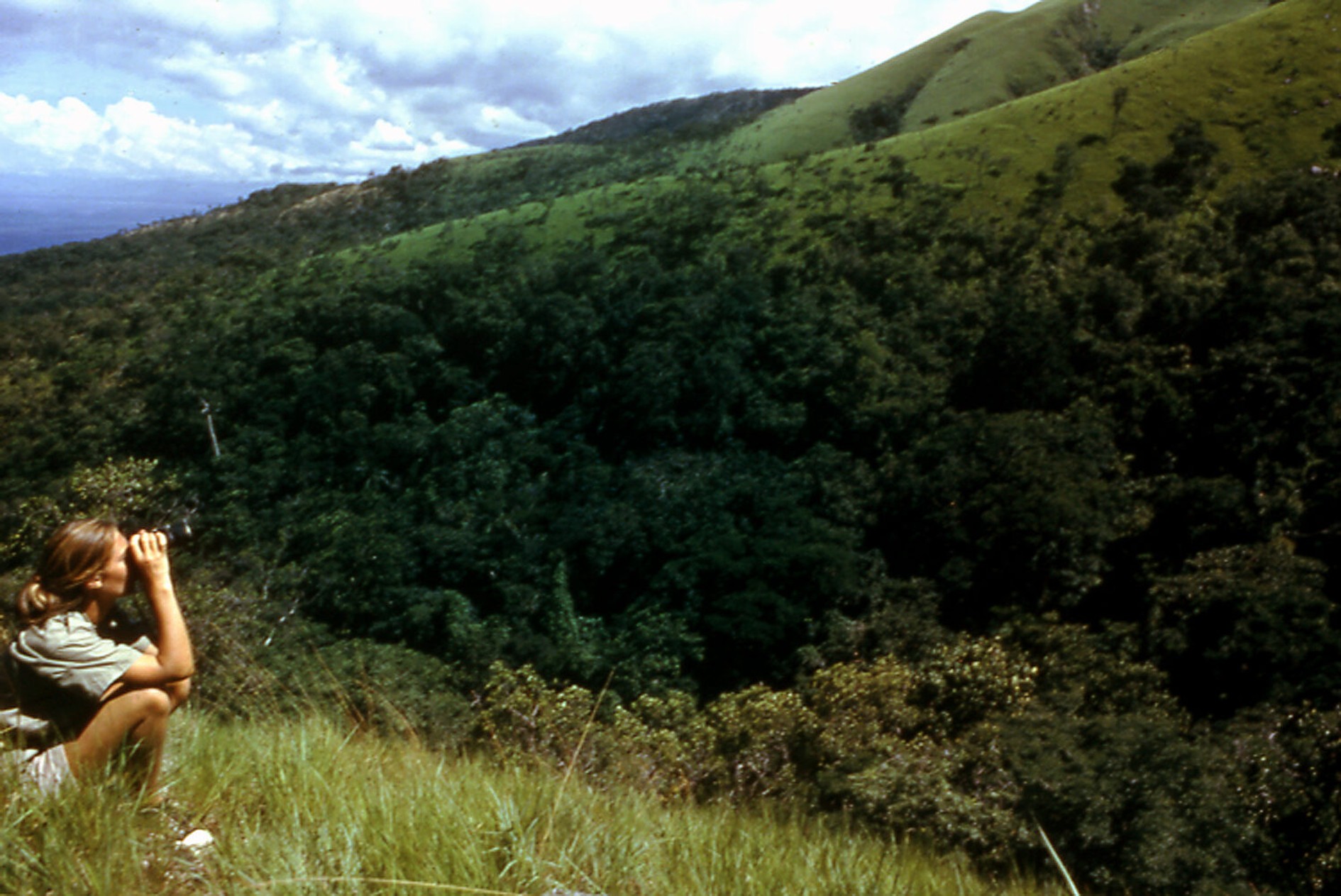Dr. Jane Goodall távcsővel kutatja a csimpánzokat a tanzániai Gombe Nemzeti Park csúcsán.