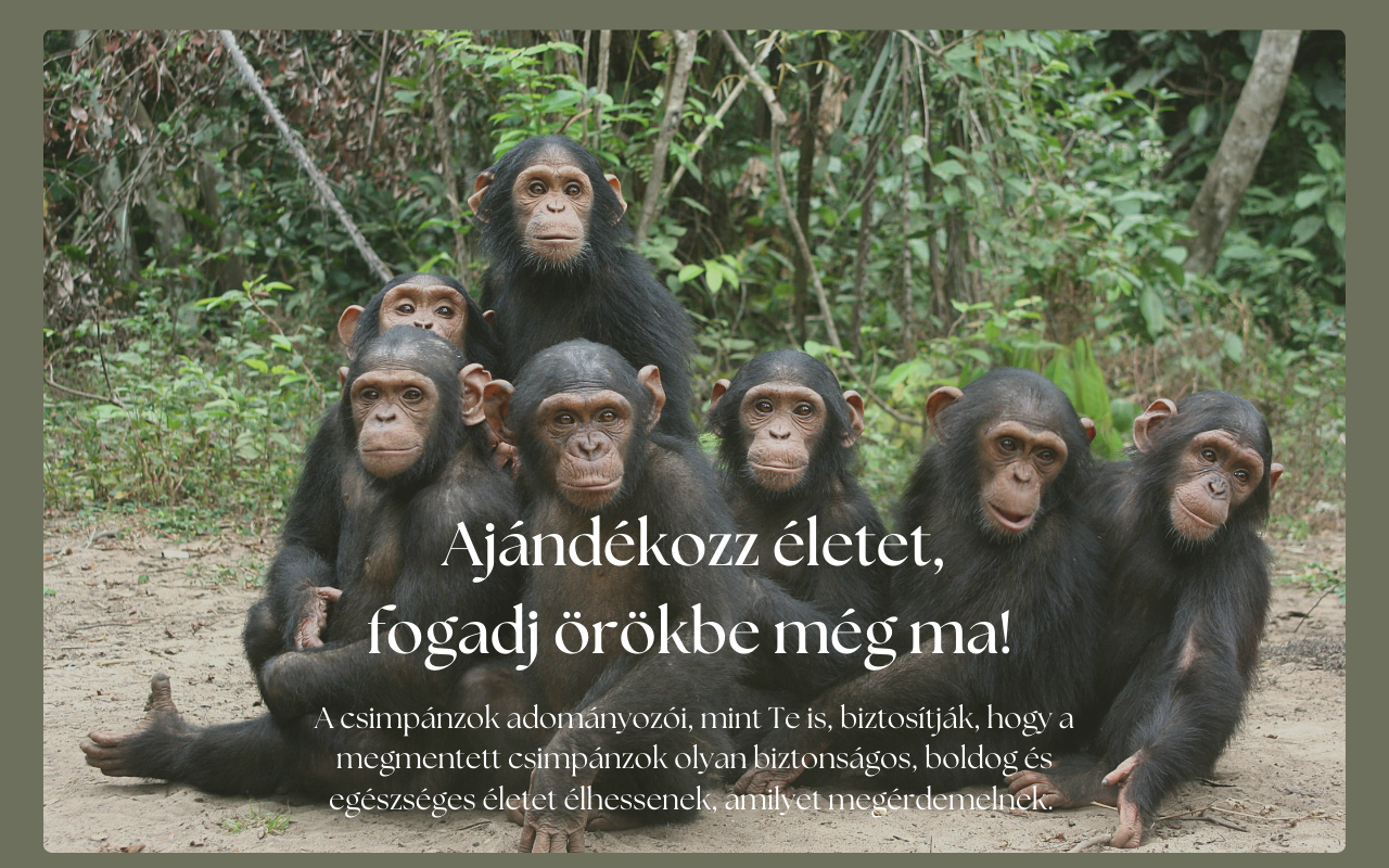 Bár a vadon élő csimpánzok a kihalás szélén állnak, Magyarországról is van esélyünk tenni a megmentésükért. A hazai Jane Goodall Intézet jelképes örökbefogadási programja közvetlen hidat épít közted és a Kongói Köztársaságban található Tchimpounga Rezervátum között. Ez a különleges menedékhely az orvvadászat és az élőhelypusztulás elől kimentett árva csimpánzoknak ad második esélyt.